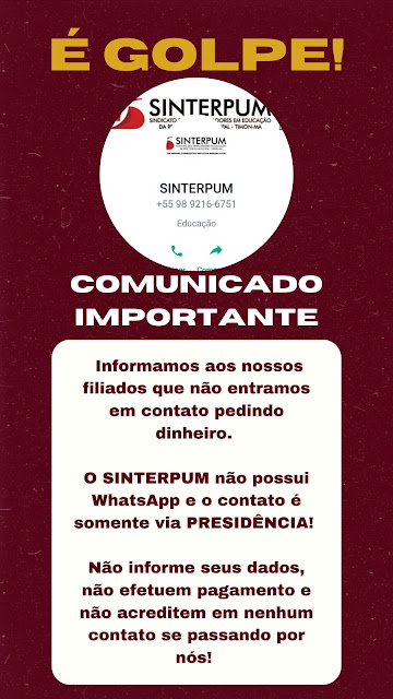 Chegou ao conhecimento da direção do SINTERPUM que criminosos estão entrando em contato com vários filiados com objetivo de lesa-los, afirmando que existe um valor a ser recebido, mas que só será pago após o depósito de uma taxa de imediato.